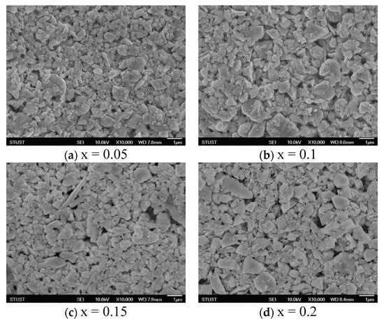 The addition of 0.1 mole of Mn resulted in 0.234 for FWHM (110) and 0.227 for FWHM (111), which were the lowest compared to other proportions. In addition, it had a maximum crystallinity of 98.577, a theoretical density of 5.5 g/cm3, and an average grain size of 0.277 μm. Therefore, it can be concluded that this proportion produced a better structural state and more perfect grain growth. When 0.15 and 0.2 mole of Mn are added, the over-addition of Mn leads to a decrease in crystallinity and collapse of the crystal structure. When 0.2 mole of Mn is added, because the radius of Mn4+ ions is 0.053 nm and the radius of Ti4+ ions is 0.0605 nm, the over-addition will cause the B site to shift its internal center, which will not be able to satisfy the valence bond required for the formation of the ABO3 structure during the crystallization process. As noted in the literature, the addition of Mn at x ≤ 0.35 produces Mn2+ with an ion radius of 0.067 nm, whereas the ion radii of Ba2+ and Sr2+ are 0.135 nm and 0.118 nm, respectively. Because Mn2+ and Mn4+ ions are small enough to enter the A-site in the crystal lattice, they cause displacement or recrystallization, resulting in the formation of impurity and recrystallized phases []. The experimental results show that the appropriate addition of Mn can effectively improve the grain growth and film quality, as in the surface microstructure state shown in Figure 7. The 0.1 mole Mn of BTM film exhibits excellent theoretical density (g/cm3), average grain diameter (μm), and crystallinity (%), as shown in Table 3.