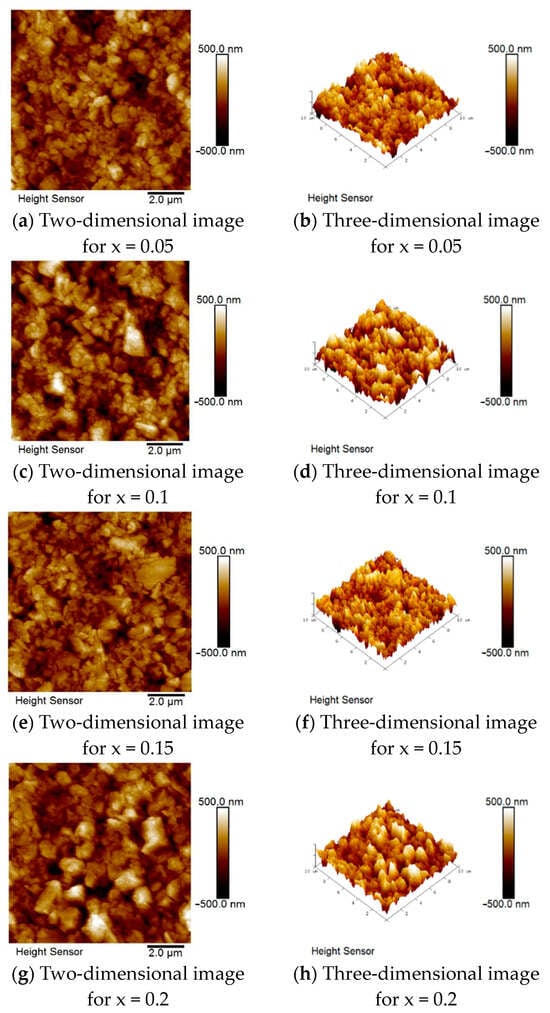 Figure 8 shows the AFM images for each proportion, in which the surface deposition state of each film sample is observed from the 3D image of its surface microstructure. As shown in Table 4, the average roughness was 86.5 nm, the root mean square roughness was 111 nm, and the maximum height roughness was 1044 nm with the addition of 0.1 mole of Mn, which are slightly lower than those of other additive ratios. Therefore, it can be concluded that with the addition of 0.1 mole of Mn, the film surfaces are flatter and have fewer defects. In addition, the number of defects indirectly contributes to problems such as current leakage and energy barriers in subsequent device fabrication. The higher the manganese addition ratio, the greater the surface roughness, which may be due to structural collapse or secondary crystalline phases formed by recrystallization during the reaction process in the case of heavy doping.