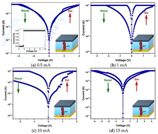 Next, the memory window of the BST resistive memory was determined by scanning back and forth with different compliance currents, as shown in Figure 9. As seen in Figure 9a, for 0.5 mA compliance current, there was no clear transition state between high and low resistance states (abbreviated as HRS and LRS) because the formation and breakage of resistive filaments in the element was slow or had not yet occurred due to insufficient current. As shown in Figure 9b, for 1 mA compliance current, the memory window appeared but a cutoff current was generated in the LRS, due to insufficient current being supplied so that the device did not have a large enough operating current during the switching process. And as seen in Figure 9c, for 10 mA compliance current, the memory window increased significantly, with an on/off ratio of about 1 and a leakage current of about 10−3 A. But for 15 mA compliance current, the formation of excessive resistive filaments leads to the near collapse of the film due to the transient passage of too many carriers, resulting in a significant reduction of the memory window, and the excessive resistive filaments tend to prevent the complete breakage of the device during the switching process, resulting in an increase in leakage current, as shown in Figure 9d. Therefore, it can be concluded from the experiments that the most optimal characteristics of the BST memory element are obtained at 10 mA current.
