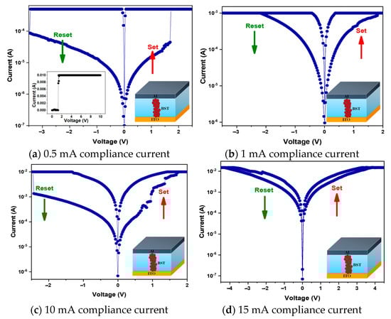 The memory window of the BSTM resistive memory was determined by scanning back and forth with different compliance currents, as shown in Figure 10. For a compliance current of 0.5 mA, the on/off ratio was approximately 1 and the leakage current was approximately 10−4 A. However, the operating voltage was higher because the small compliance current resulted in a higher voltage being required for carrier migration after the filament formation, as shown in Figure 10a. For 1 mA compliance current, the operating voltage dropped significantly and the storage window became smaller. We believe that the insufficient compliance current and the simultaneous decrease in the operating voltage led to a decrease in the switching speed between the break and formation of the resistive filament in the memory element and an unstable state at the set terminal, as shown in Figure 10b. For a compliance current of 10 mA, the on/off ratio was about 5, the memory window was significantly increased compared to other compliance current conditions, the leakage current was about 10−7 A, and the operating voltage dropped to −1–0.8 V. At this point, the channel formed by the resistive filament in the device was large enough for carriers to pass through quickly under low-voltage operating conditions, as shown in Figure 10c. But for 15 mA compliance current, the memory window decreased and the operating voltage increased because thicker resistive filaments were formed after a larger or excessive current was applied, resulting in incomplete resistive filament breakage and increased leakage current during reset, and the high current condition would easily cause the film to collapse, as shown in Figure 10d.