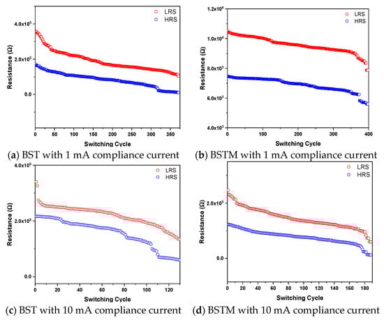 For 1 mA compliance current, the number of operations of the BST resistive memory was increased to about 370, and the current degradation was slightly improved, as shown in Figure 11a. Meanwhile, the switching between the HRS and LRS of the BSTM resistive memory became more pronounced, and the number of operations was increased to about 400, as shown in Figure 11b. Next, at a limiting current of 10 mA, the difference between the HRS and LRS of the BST resistive memory was more stable, but as the number of operations increased, the current gradually decreased, and the switching characteristic disappeared after about 130 operations, as shown in Figure 11c. The reason for this is thought to be that prolonged operation at high currents causes the film in the device to collapse and carriers to accumulate at the junction, creating a barrier that prevents electrons from passing through efficiently. In Figure 11d, it can be seen that between the HRS and LRS of the BSTM resistive memory, although there is a gap of five orders in the memory window at the beginning, the memory window gradually deteriorates due to the high current. In addition to the switching stability of the BSTM memory, the decrease in current with the number of operations is slightly smaller compared to the BST resistive memory, and the switching characteristic gradually disappears after 190 operations.