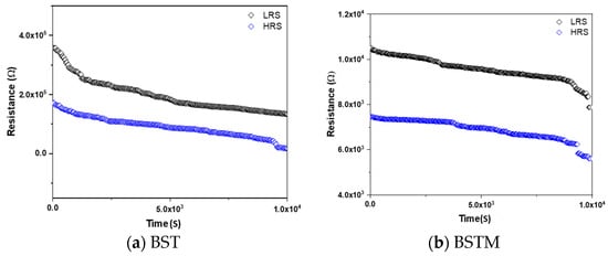 In addition to the number of consecutive operations of the device, the retention time is also an important indicator. Therefore, in this section, a 10,000 s test was performed on the BST and BSTM resistive memory devices to determine the on/off retention time of the devices. Figure 12 shows that these devices still maintained a stable HRS and LRS after the 10,000 s test.