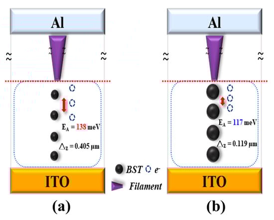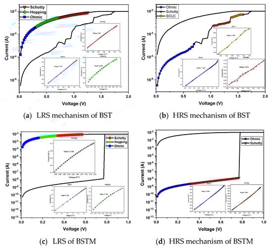 The electrical conduction mechanism in the I-V curve fitting of the resistive memory devices plays an important role, and the related measurement method is discussed and experimental results are provided in our previous study []. The conduction mechanism of BSTM resistive memory was analyzed, as shown in Figure 13c,d, for the experimental results. At low voltages, the HRS and LRS conduction mechanisms both had a fitting slope of 1, thus conforming to ohmic conduction. As the voltage increased, the electrons were thermally excited, causing them to jump between defects on the LRS, resulting in hopping conduction. A further increase in voltage then gave the electrons enough energy to cross the energy barrier, resulting in Schottky emission conduction.