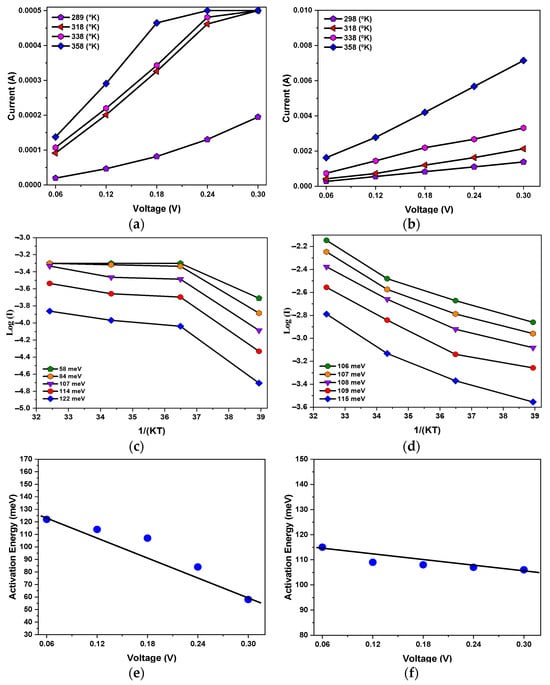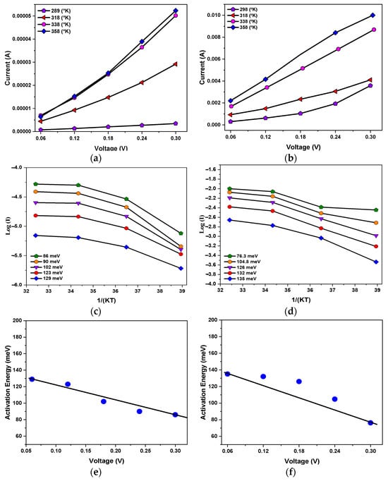 Temperature-dependent current measurements were performed on the test films at 289, 318, 338, and 358 K with a compliance current of 0.5 mA, and the results are shown in Figure 16a. The current increased with increasing temperature, which is consistent with the theory that current is proportional to temperature, as described in the literature [].