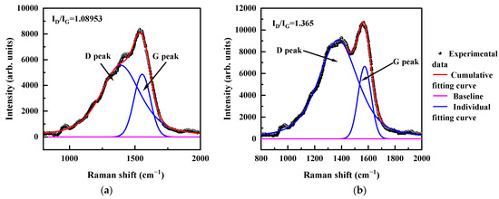 In Figure 2, the ID/IG value of DC sputtering is 1.089, and that of the linear ion beam is 1.365. The SEM image shows that the particle size of the a-C:H film prepared by linear ion beam is larger than that of the a-C film prepared by DC sputtering. Since the a-C:H film has more defects, the ID/IG is large, indicating that the content of nanocrystalline graphene in the DC sputtered amorphous carbon film is higher than that in the ion beam amorphous carbon film because of the thermal decomposition of acetylene by the DC sputtered. Due to the weak adsorption at the adsorption boundary, the C–H bonds were broken in the film, unbonded hydrogen atoms were desorbed, and a large number of hydrogen atoms escaped from the film as hydrogen gas or CxHy. The dehydrogenated carbon structure underwent rearrangement driven by thermal energy and enhanced diffusion, and the broken sp2 bonds are interconnected to form more six-membered rings. This led to the increased ordering of the films and the increased content and size of nanocrystalline graphite clusters, indicating that the films’ graphite-like carbon features were enhanced.