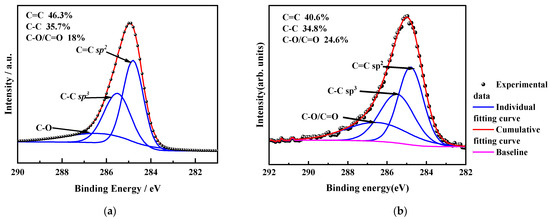 The chemical composition and chemical bonding of the amorphous carbon films were characterized using X-ray photoelectron spectroscopy (XPS, Axis UltraDLD, Kyoto, Japan); the films were first etched by Ar+ ion of 5 kV for 5 min to remove any oxides from the surface. The C 1s peaks were divided into three peaks by Gaussian (80%) and Lorentzian (20%) functions. The 284.6 eV, 285.4 eV, and 286.5 eV binding peaks shown in Figure 3 correspond to the sp2 hybridization (C=C), sp3 hybridization (C–C), and C–O/C=O hybridization, respectively. The content of sp2 hybridized carbon can be inferred by integrating the area of sp2 and sp3 hybridized carbon peaks. As shown in Figure 3, the content of C=C in the DC sputtered carbon film is 46.3%, while that in the ion beam deposited carbon film was 40.6%, much lower than that of DC sputtering. It also indicates that the content of sp2 hybridized carbon bond in the ion beam carbon film is lower than that in the DC sputtering. The C–C content of DC sputtering is 35.7%, and the C–O/C=O content is 18%. For the film deposited by the linear ion beam, the C–C content is 34.8%, and the C–O/C=O content is 24.6%. Both types of carbon films have higher sp2 content than sp3 content inside.