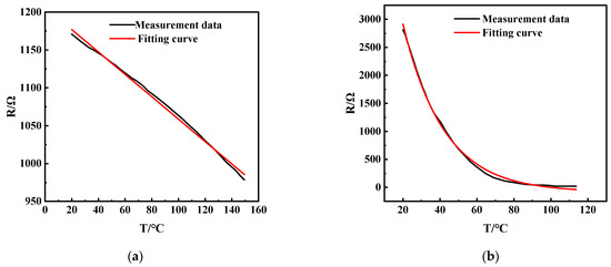 We used the oven (ESPEC PG-2J, Osaka, Japan) for temperature testing with a temperature fluctuation range of ±0.3 °C, which was carried out in the programmed operation mode, and the slope control was applied to the temperature rising process. The multimeters (FLUKE 8846A, Everett, WA, USA) were used to record the data. Figure 4a shows the test results of sample A, which has good linearity in the range of 20 °C~150 °C. The temperature coefficient of resistance (TCR) of the temperature sensor was 1.28 × 10−3/°C. After fitting, the relationship between the resistance (R) and the temperature (T) can be fitted as follows: