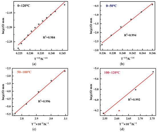 As shown in Figure 5, we fitted the relationship between resistivity ρ and temperature T, which allows us to analyze the mechanism of carrier transport in the material. Unlike crystalline semiconductors, the localized electrons in amorphous semiconductors can only be conducted by tunneling or thermal activation [30]. The resistivity-temperature curve of an amorphous semiconductor is related as follows [31]:
