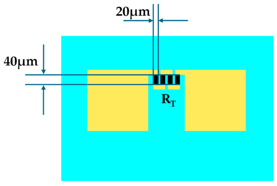 where UC is the output load voltage (the actual output voltage), RC is the output load, and I is the current flowing through the temperature sensor bridge leg. From Equation (6), when R is too large, UC deviates too much from the ideal value. As can be seen from Equation (7), when R is too small, the current flowing through the bridge leg is too large, and power consumption increases. Therefore, the bridge leg resistance of a-C temperature-sensitive material is 2~5 kΩ, and the current is below 1~2 mA. Due to the resistivity of the a-C film is 0.01Ω∙cm, to ensure that the resistor resistance is below 4 kΩ, the length of the resistor is eight times the width, which takes up more space. As shown in Figure 7, the resistor is therefore designed as a quadruple-fold resistor strip, and the size of each fold of resistor strips is 40 × 20 μm (l × w).
