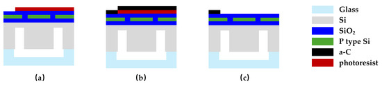 Temperature sensor processing flow diagrams. (a) Photolithography; (b) a-C deposition; (c) lift off.