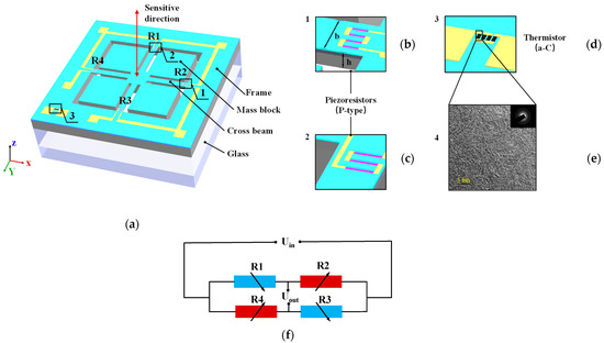 (a) Schematic of accelerometer; (b) zoomed-in view of R2; (c) zoomed-in view of R1; (d) zoomed-in view of temperature sensor; (e) TEM picture of the surface of the a-C temperature sensor. (f) read-out circuit.