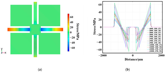 The length, width, and thickness of the beam are essential influences on the maximum stress of the sensitive structure, and parametric scanning is required to determine the optimal structural dimensions. The finite element simulation results under multiple dimensions are shown in Figure 10b. The x-direction stress distribution on the upper surface of the four-beam sensitive structure is significantly affected by the dimensions of the sensitive beam. Due to the symmetry of the structure, there is no need to discuss the stress distribution in the y-direction. From Figure 10b, the stress at the root of the beam is maximum when the beam size (l × b × h) is 1000 μm × 150 μm × 15 μm.