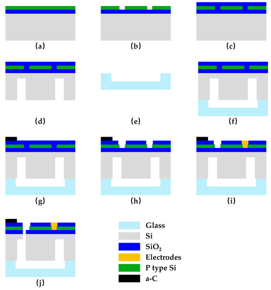 Integrated temperature sensor and accelerometer processing flow diagrams. (a) Ion injection; (b) resistor etching; (c) deposited insulation layer; (d) back cavity etching; (e) glass corrosion; (f) silicon-glass bonding; (g) thermistor deposition; (h) metal wire etching; (i) electrode sputtering; (j) front structure release.