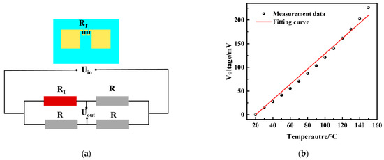 We placed the integrated sensors in the oven to test the temperature characteristics. The temperature-sensitive resistor was connected to the Wheatstone circuit shown in Figure 12a, and the other three legs of the Wheatstone bridge were adjusted so that their resistance was equal to that of the thermistor of the integrated sensor in the initial state. The circuit was supplied with a voltage of 5 V, and the output voltage was 0 mV in the initial state. Figure 12b shows the output voltage versus temperature of the temperature modules of the integrated sensor. The sensor was in the range of 20~150 °C. Since the quad-folded a-C thermistor had a large resistance (of approximately 4.7 kΩ), the current of each leg in the Wheatstone bridge was 0.5 mA. Meanwhile, comparing the external temperature, the power consumption of the sensor was sufficiently low so that the self-heating effect was negligible. By the linear fitting of this output–temperature relationship, the sensitivity, and linearity of the sensor were obtained. The linearity is expressed by the coefficient of determination (R2) of the fitted line. The sensor has good linearity in the range of 20 to 150 °C, the sensitivity is 1.62 mV/°C with the input voltage of 5 V, and the linearity is 0.99578. The temperature module of this integrated sensor has better linearity and higher sensitivity than other temperature sensors (Table 3).