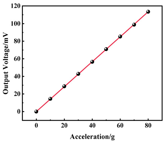 The centrifuge system used in this paper is the SY30-3 centrifugal constant acceleration tester developed by Suzhou Dongling Vibration Testing Instrument Co., Ltd. (Suzhou, China). The tester consists of the control mainframe and the working rotary table. The main structure of the SY30-3 rotary table steady-state acceleration tester (centrifugal machine) consists of a speed measurement system, a motor, a speed reducer, a working rotary table, and an electrically conductive slip ring. The centrifuge system can apply a maximum acceleration of 80 g, and the minimum acceleration interval is 3 g. During the experiment, the control host generated the control signal to drive the rotary table to rotate, thus generating the acceleration signal. The sensor in the system is powered by a DC power supply with an excitation voltage of 5 V; the output of the sensor is detected by a desktop multimeter. The acceleration test range of the experiment is 0–80 g. The sensitivity of the accelerometer can be obtained from Figure 13 as 1.4 mV/g/5 V. The linearity is 0.38%, and the repeatability is 1.56%.