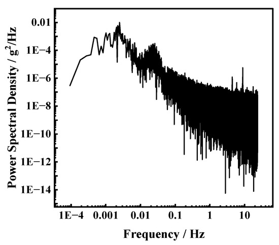 In order to evaluate the acceleration measurement resolution of the accelerometer, a noise floor evaluation experiment was conducted. The sensor was placed in a laboratory environment for 3 h with a sampling rate of 208 Hz. The noise power density spectrum (PSD) is shown in Figure 14, which shows that the average power per unit of noise frequency fluctuates between 10−13 and 10−6 g2/Hz when the vibration frequency of the integrated sensor is greater than 1 Hz. The total thermomechanical noise in the range of 1~20 Hz is 509 µg, and the average thermomechanical noise density is 116 µg/, they are two to three magnitudes smaller than the input acceleration amplitude for testing sensitivity. Therefore, they do not significantly affect the sensor measurements or the derived performance metrics.