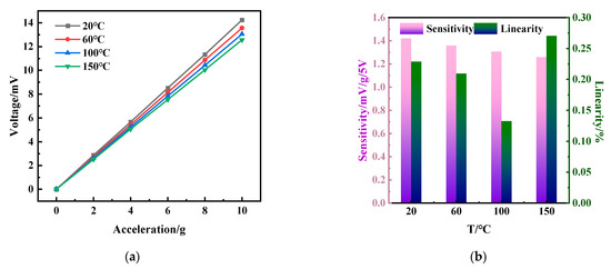 Temperature effect on the accelerometer of the integrated sensor. (a) The output voltage versus acceleration in the temperature range of 20 °C to 150 °C; (b) the sensitivity and linearity of the accelerometer in the temperature range of 20 °C to 150 °C.