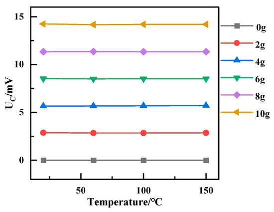 where U(T) is the sensor output, S(T) is the sensor sensitivity, and UZ(T) is the zero bias of the sensor at temperature T; S(T) decreases as the temperature increases from 20 to 150 °C. According to (5), the temperature compensation is expressed as follows: