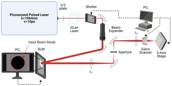 Schematic of optical setup used for ps laser processing (Created with BioRender.com). The beam was attenuated by a λ/2 plate and a Glan-Laser Calcite Polarizer transmitting horizontal polarization. The beam passes through a diffraction-limited beam expander (Rodenstock; M = x3) and is then modulated by a reflective phase-only SLM and input to a galvo scanner after passing through a 4f optical system. An aperture allows the shaped zero-order light to pass through for laser processing.