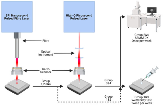 Schematic of the experimental process: laser process and surface property analysis methods (Created with BioRender.com). Four groups (1–4) of polished samples were processed with the ns laser to form the underlying micron-scale doubly periodic structure, while groups 3 and 4 were then also exposed to ps laser processing for LIPSS overlaying. For comparison, groups 1 and 3 were subjected to wettability tests twice a week, while groups 2 and 4 were measured for elemental concentration by EDX once a week. All samples were stored in ambient air during ageing.