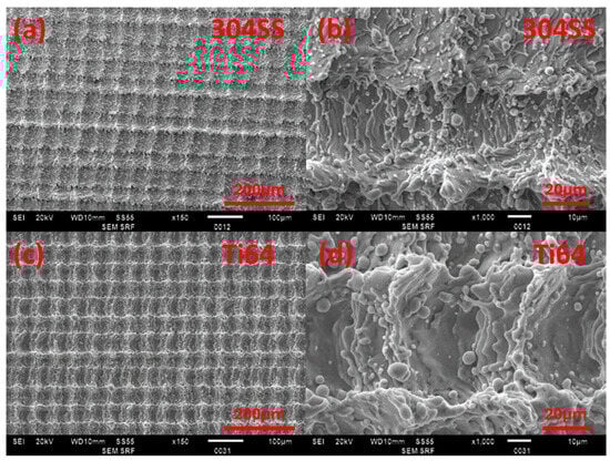 The average surface roughness of grid structures created by ns laser ablation was measured to be Ra = 3.4 ± 0.6 µm and Rq = 3.5 ± 0.8 µm for 304SS and Ra = 7.5 ± 0.8 µm and Rq = 7.8 ± 1.2 µm for Ti64. Figure 3a,c shows the low-magnification SEM images of 304SS and Ti64, respectively. The higher magnification images in (b) and (d) show evidence of melting, which is to be expected when processing with longer ns pulse lengths.