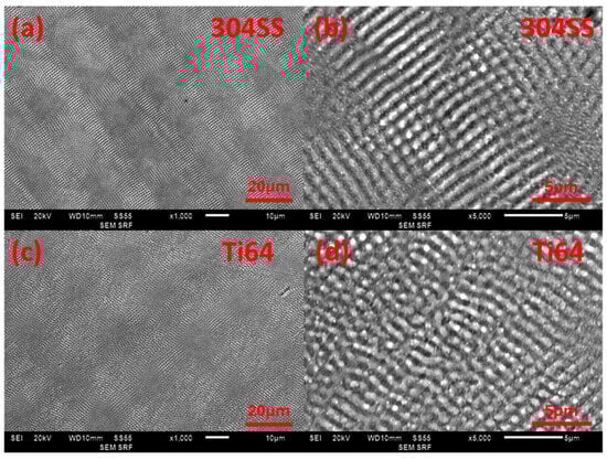 SEM image of LIPSS on 304SS and Ti64 surfaces: (a,c) ×1000 magnification and (b,d) ×5000 magnification.