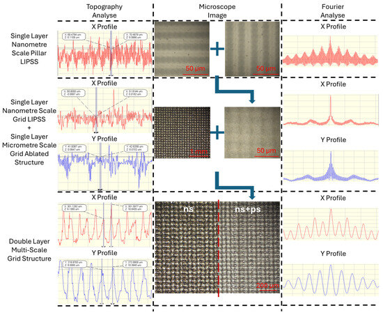 Figure 5 displays the observed topography curves of the single-scale structures and multi-scale structures, alongside their microscope images and Fourier transform analysis of the topography. The data confirm that the LIPSS created using the ps laser belong to the category of LSFL, as their pitch Λ = 1.05 ± 0.10 µm is close to the laser wavelength. The size of the crosshatch structures is close to the hatch distance. Fourier transform analysis shows that the addition of LIPSS does not significantly affect the average surface roughness, yet microscope images show that the overlay of LIPSS impacts the characterisation of the samples by smoothing ablation profiles and reducing optical scatter.