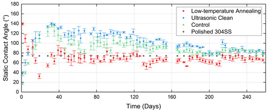 Figure 6 shows the variation with time of the measured CA of ns laser textured 304SS for each of the post-process treatments: annealing and ultrasonic cleaning. A control group with neither treatment applied is included for comparison, as is the static contact angle of the polished unprocessed batch measured at the beginning of the experiment (74.1°). Clear transitions from hydrophilic to hydrophobic (or vice versa) properties are observed.