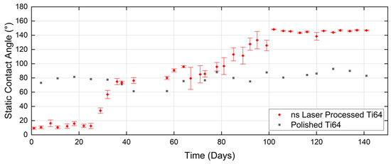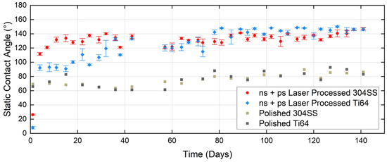 Wettability behaviour of ns + ps laser processed 304SS and Ti64 surfaces over a period of 141 days.