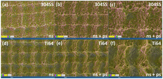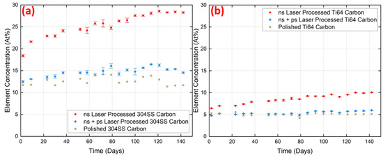 Figure 9a,b shows the variation in carbon concentration (At%) at the surface of each material, measured over a 140-day period following each type of laser processing. Here, we were interested in tracking changes in the concentration with time, though it is also evident that in the ns laser process case, there is more carbon at the surface than immediately after dual ns + ps laser processing. For the ns laser process case, both 304SS and Ti64 surfaces exhibit significant changes in carbon content during the ageing process, and with similar trends. No other element underwent such a significant change over the period. For 304SS modified by ns laser only, the carbon concentration increased by 10 At% over 140 days of ageing, compared to 4 At% for the ns + ps laser modified surface (i.e., 2.5 times more). For the Ti64 modified by ns laser, the carbon content increased by 3.5 At% over the same period (3.5 times the 1 At% for the ns + ps laser case). The ns + ps laser-treated surface started with a lower carbon concentration and exhibited a relatively lower growth rate.