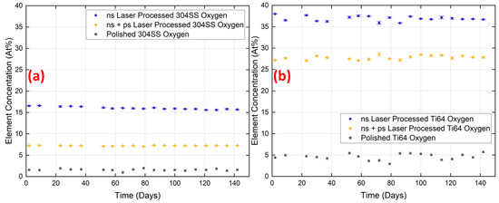 Comparison of time-dependent variation in oxygen composition at the surface of samples processed by ns and (ns + ps) lasers, followed by ultrasonic cleaning: (a) 304SS and (b) Ti64.