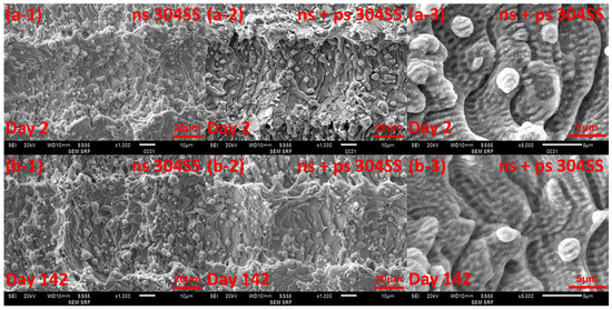 SEM images of 304SS on (a) day 2 and (b) day 142. ns (a-1,b-1) and ns + ps (a-2,b-2) laser processed surface structure ×1000 magnification and (a-3,b-3) ×5000 magnification.