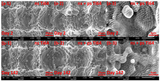 SEM images of Ti64 on (a) day 2 and (b) day 142. ns (a-1,b-1) and ns + ps (a-2,b-2) laser-processed surface structure ×1000 magnification and (a-3,b-3) ×5000 magnification.