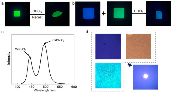 - Zhou, Q.; Bai, Z.; Lu, W.-G.; Wang, Y.; Zou, B.; Zhong, H. In situ fabrication of halide perovskite nanocrystal-embedded polymer composite films with enhanced photoluminescence for display backlights. Adv. Mater. 2016, 28, 9163–9168. [Google Scholar] [CrossRef] [PubMed]