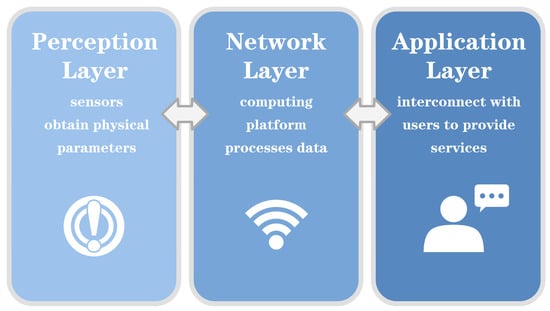 The IoT consists of three layers—a perception layer, a network layer, and an application layer [10]—as shown in Figure 1.