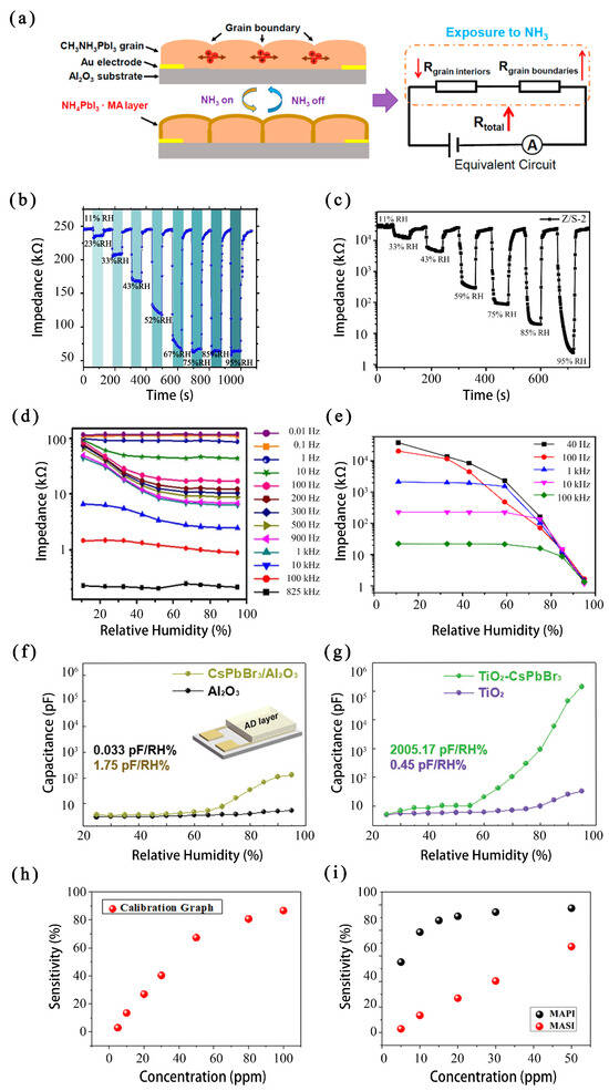 (a) Illustration of an NH3-sensing mechanism in MAPbI3 film [40]. Impedance response of the humidity sensor at different RHs: (b) CsPbBr3; (c) ZnO/SnO2. Impedance response of the humidity sensor at different operating frequencies: (d) CsPbBr3; (e) ZnO/SnO2 [41,42]. Capacitance variation with different RHs ranging from 25 to 95 RH%: (f) Al2O3 and CsPbBr3/Al2O3; (g) TiO2 and CsPbBr3/TiO2 [43]. (h) Sensitivity of the lead-free halide perovskite-based gas sensor at different NH3 concentrations. (i) Comparison of sensitivity between lead halide MAPbI3 (MAPI) and lead-free halide MASnI3 (MASI) perovskite NH3 sensors both grown on a fabric substrate [44].