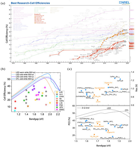 (a) Development of perovskite solar cells’ PCE [70]. (b) Functional relationship between performance and bandgap of several photovoltaic technologies when indoor light is between 50 and 3000 lx [72]. (c) Comparison of PCE and VOC between perovskite IPV and other IPVs [73].