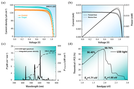 Indoor photovoltaic performance of wide-bandgap PSCs: (a) current density-voltage (J-V) curves of control and target wide-bandgap PSCs under LED light with 1000 lux and 300 K; (b) indoor current-voltage (I-V) and corresponding spectrum distribution with an integrated power density of 338.2 mW/cm2 under U30 light of 1000 lux; (c,d) U30 light spectrum distribution with an integrated power density of 338.2 mW/cm2 and the corresponding Shockley-Queisser limit of PCE of an ideal photovoltaic device as a function of bandgap energy [93].