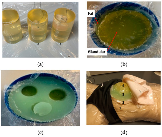 (a) Three cylindrical-shaped glandular phantoms: (1) reference, (2) with 1 cm tumor, and (3) with a 2 cm tumor; (b) breast phantom “Very Dense” with 0.5 cm thick fat layer; (c) breast phantom “Dense” with the glandular phantom inserted into the fat phantom; (d) measurement setup with phantoms set on the mannequin torso (1), above which the muscle phantom is first assembled (2), fat (3), glandular (4), and skin (5) phantoms [30].