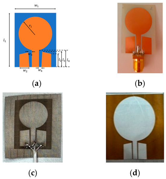 Antennas used in the vest. (a) UWB monopole antenna design, (b) UWB monopole with flexible laminate substrate, (c) UWB monopole with conductive textile material, (d) Kapton polyamide substrate-based larger monopole [31].
