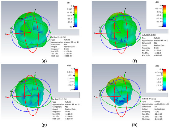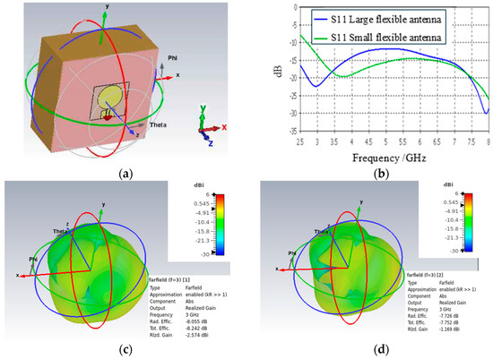 As known from the literature, antennas with a thin and flexible substrate have weaker performance compared to antennas with a rigid substrate [11]. From the results presented in Figure 3c–h, it is found that the larger flexible antenna slightly outperforms the smaller flexible antennas, especially in terms of realized gain. However, the differences in the lobe strengths towards the body are not very significant. Hence, both antenna structures are feasible for a breast tumor monitoring vest. Measured characteristics of these antennas are evaluated in [31].