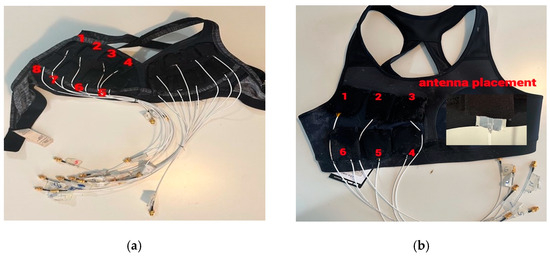 The developed breast tumor monitoring vest types used in the evaluations: (a) Vest I with smaller flexible antennas and (b) Vest II with larger flexible antennas [31]. The numbers above the antenna pockets indicate the antenna number.