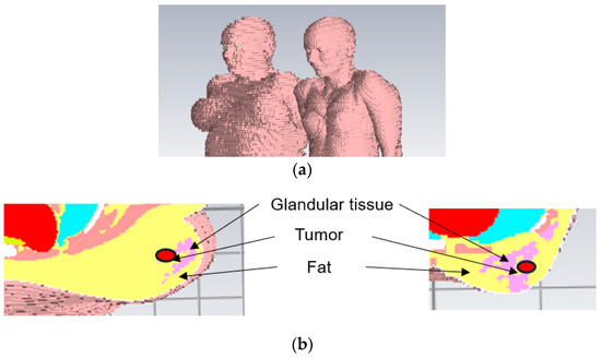 Simulations were carried out using electromagnetic simulation software CST [33] and its anatomically realistic voxel models Laura and Emma, as shown in Figure 5. The Laura voxel corresponds to a lean woman with breast density type heterogenous consisting of glandular tissue and fat tissue relatively evenly. The Emma voxel resembles an overweight woman having breast density scattered fibro glandular (less dense) in which the breast consists of mostly fat tissue and only slightly glandular tissue. As illustrated in Figure 5, the voxel models exhibit pixelation, and there is a noticeable variation in mesh cell sizes among the different voxel models.