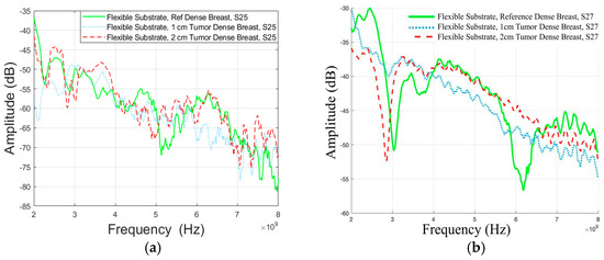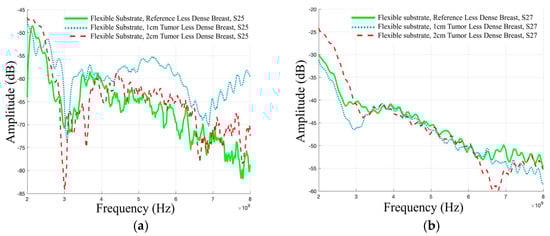 Next, the evaluations are conducted using the breast phantom type “Less Dense” and Antenna 1, Case 2. The S27 and S25 results (Case 2a and Case 2b, respectively) are shown in Figure 7a,b, respectively. In S27 parameter, both lower and higher frequencies experienced a reduction in attenuation due to tumors. The 1 cm tumor resulted in an attenuation difference of approximately 0.75 dB at 3.5 GHz and 0.39 dB at 6 GHz. Similarly, a 2 cm tumor led to a difference of about 0.65 dB at 3.5 GHz and 1.1 dB at 6 GHz. The differences in channel parameters due to tumors were slightly smaller compared to denser breast types. This is because fat, being a less obstructive medium, allowed the predominant signal components to propagate from fat.