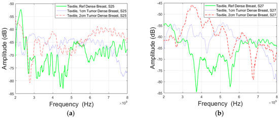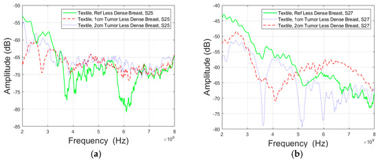 The presence of tumors also led to a decrease in channel attenuation in the case of S27 parameters, as shown in Figure 8b. In the case of the 2 cm tumor, this reduction was observed at both higher and lower frequencies, whereas for the 1 cm tumor, it was evident only at higher frequencies. Specifically, the difference in attenuation between the 1 cm tumor and the reference case was approximately −0.86 dB at 3 GHz and 4.34 dB at 6 GHz. For the 2 cm tumor case, the difference was approximately 4.96 dB at 3 GHz and 4.38 dB at 6 GHz. The results observed with textile antennas are similar to those with flexible laminate antennas in terms of how tumors affect signal strength when detecting breast tumors. This means that both textile and PCB antennas show consistent results in tumor detection, indicating that these methods are reliable for this purpose.