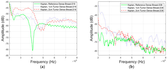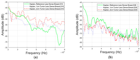 In addition to the previous findings, the study further included the assessment of channel parameters for a less dense breast type phantom using Antenna 3. The channel characteristics between antennas 1 and 6, depicted in Figure 11a (Case 6a), and antennas 3 and 6 in Figure 11b (Case 6b) show no difference between the tumor and reference case at lower frequencies Also, the difference between the 2 cm tumor and reference case is approximately 6.3 dB in Figure 11a and 4.98 dB in Figure 11b at 8 GHz.