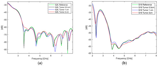 Simulations were conducted with the Emma and Laura voxels with tumor sizes 0.5 cm, 1 cm, and 2 cm as well as in the reference case. The Emma voxel was considered to use Vest II with Kapton substrate antennas due to larger breast size and the Laura voxel used Vest I with flexible laminate antennas due to smaller breast size. Similarly to the measurement-based evaluations, channel characteristics were calculated between different antenna pairs, but only the S-parameters related to the antennas which were closest to the tumor are presented for brevity. In the case of the Emma voxel, S26 parameters are presented, and for the Laura voxel, S16 parameters.