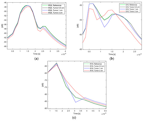 As illustrated in Figure 12a,b, the discrepancies between the reference and tumor cases vary across the evaluated frequency band. Therefore, for practical applications, it is more appropriate to select only the frequency range where the changes are consistent for analysis. For instance, in Laura’s case, the frequency domain channel responses exhibit logical changes within the 4.5–5.8 GHz band. Subsequently, the IFFT is applied solely to this range, with the results presented in Figure 13c. As observed, the IR changes are now more consistent.