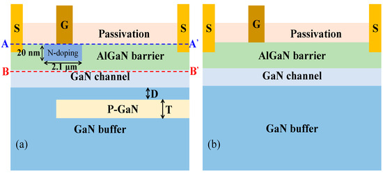 Figure 1a shows the structure of the PN-HEMT. A P-GaN buried layer in the buffer layer and a locally doped barrier layer under the gate are the notable features of the PN-HEMT. The simulations are carried out in Sentaurus TCAD [28], and physics models are introduced, such as the DopingDep and High-field dependent mobility model, the piezoelectric polarization (strain) model, the impact ionization model, and the Schockley–Read–Hall recombination model. The length and thickness of locally doped Al0.3Ga0.7N barrier are 2.1 µm and 20 nm, respectively. The doping concentration of the locally doped Al0.3Ga0.7N barrier is 1 × 1018 cm−3. The distance from the P-GaN buried layer to the GaN channel (D) is 50 nm and the thickness of the P-GaN buried layer is 0.1 µm. The doping concentration of the P-GaN buried layer is 7 × 1017 cm−3. Figure 1b shows the structure of the C-HEMT. The work function of gate is set as 5.2 eV to model the Ni/Au Schottky contact of the actual device [29]. The other parameters are shown in Table 1.