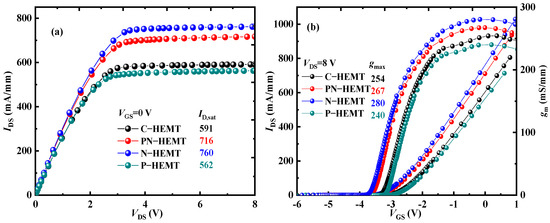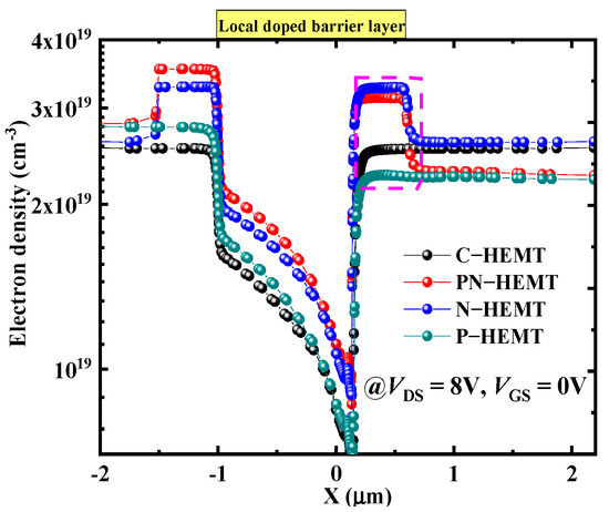 Figure 2 illustrates the DC characteristics of the PN-HEMT, C-HEMT, N-HEMT (with only the locally doped barrier layer), and P-HEMT (with only the P-GaN buried layer). The results show that a much higher saturated drain current (ID,sat) and maximum transconductance (gmax) are achieved for the N-HEMT and PN-HEMT. This improvement is attributed to the locally doped barrier layer in the proposed structures. In the PN-HEMT and N-HEMT, the locally doped barrier layer provides additional electrons to the channel, thereby enhancing electron density from the x-coordinate at the gate’s right-side edge to the locally doped barrier’s right-side edge [34], as shown in the dashed pink box in Figure 3. Consequently, a much higher ID,sat is observed for the N-HEMT and PN-HEMT. Moreover, the lowest ID,sat is observed in the P-HEMT, as the buried P-GaN island partially depletes the 2DEG. Compared to the ID,sat and gmax of 591 mA/mm and 254 mS/mm in the C-HEMT, a higher ID,sat of 716 mA/mm and gmax of 267 mS/mm are achieved in the PN-HEMT.